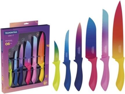 ترامونتينا – مجموعة سكاكين ملونة بشفرات من الستانلس ستيل ومقابض من البولي بروبلين مطلية ومغطاة بالانزلاق والأناقة والوان والكفاءة والجودة، تتضمن 6 قطع