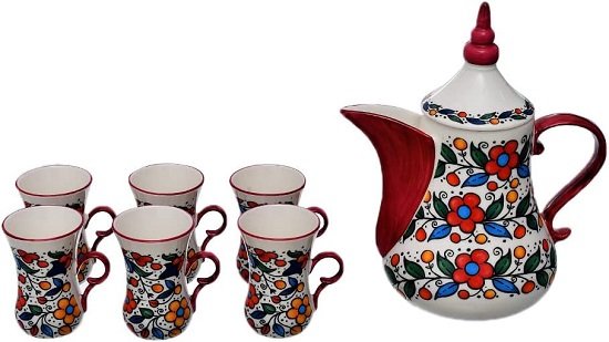 طقم شاي بورسلين عالي الجودة من روزا اف ام (ابريق شاي بغطاء و6 اكواب شاي)، 8 قطع – احمر مشجر